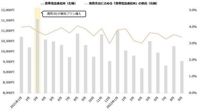 通信業界で激しい価格競争が展開されていますが、実は家計が負担する通信料金はそれほど下がっていません。大手3社が一斉に格安プランをリリースした2021年3月以降も、家計の携帯電話通信料はおおむね1万円前後、消費支出全体に占める割合も3.5%前後でほぼ横ばいです。リリースから日が浅いこともありますが、格安プランへ見直す人は意外に少ないのかもしれません。