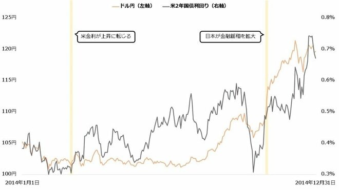 スカイマークが破綻した理由の1つに円安があると考えられています。当時、市場ではアメリカの金融緩和の縮小が意識されていました。金融政策を反映しやすいとされる2年債利回りは2014年3月ごろから上昇を始め、ドル円も年の後半から上昇を始めます。そして同年10月2日、市場の思惑通りアメリカは量的金融緩和の終了を表明しました。