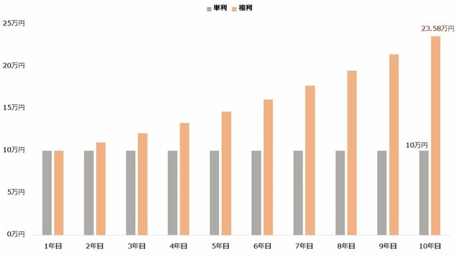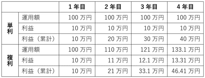 「複利」とは、元本に利益を再投資し続けて運用する方法です(反対は「単利」)。運用額が増え続けるため、2年以上運用すると同じ利回りなら必ず単利より複利の方が大きな利益を得られます。