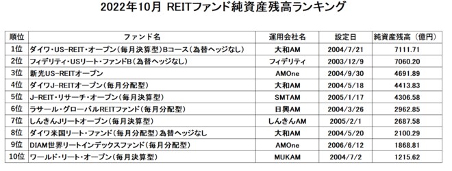 REITファンドの2022年10月末時点における純資産残高ランキングは、以下の通り。