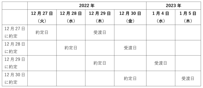 国内株式の場合、売買が成立してから2営業日後、売買した日を含むと3営業日後が受渡日です。従って、逆算すると12月28日が年内受け渡しの最終取引日となります。