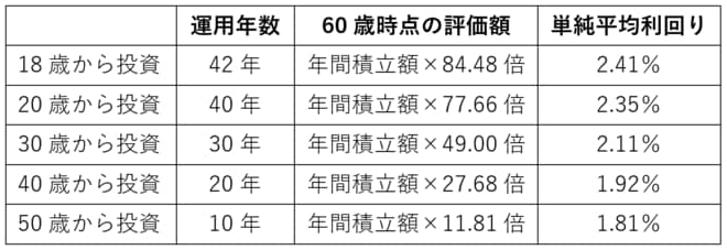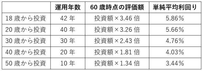 対して、同じく利回り3%の商品で30歳から60歳まで運用するケースでは、1年あたりの単純平均利回りは4.76%にとどまります。同じ利回りの商品に投資したはずが、運用期間の長短で1年あたりの利益に1%以上の差が生じました。