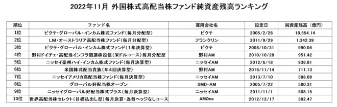 2022年11月末時点における外国株式高配当株ファンドの純資産残高ランキングは上記の通りである。外国株式の代表的な高配当株ファンドを比較するため、ファンド名に「配当」「インカム」「連続増配」のキーワードを含むものを抽出し、純資産残高ランキング(11月末時点)を作成した。この中から、注目ファンドを3つ紹介する。