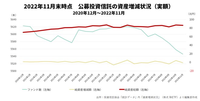 海外株式型や複合資産(バランスファンド)での資金流入が続いたことから、公募株式投信(ETF除く)には5,438億円の資金流入があり、24カ月連続で資金流入超となった。ただ、純資産残高は約7,084億円減少し、2カ月ぶりの減少となった。10月後半に150円台を突破したドル円相場が、11月には140円割れの水準まで大きく円高・ドル安が進んだことから、「先進国株式」や「先進国債券」を中心に基準価額が下落したからだ。10月までの円安・ドル高トレンドが変わった可能性もあり、今後の資金動向に変化があるのかどうかに注目している。