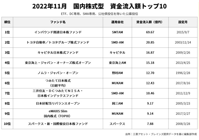 11月の資金流入額1位は「インバウンド関連日本株ファンド」(69.67億円)