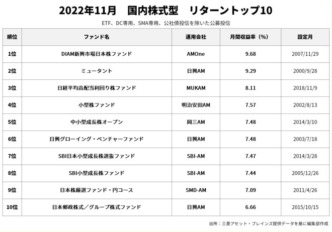 11月のリターン1位は「DIAM新興市場日本株ファンド」(9.68%)