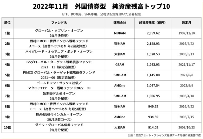 11月の純資産残高1位は「グローバル・ソブリン・オープン(毎月決算型)」(2,959.62億円)