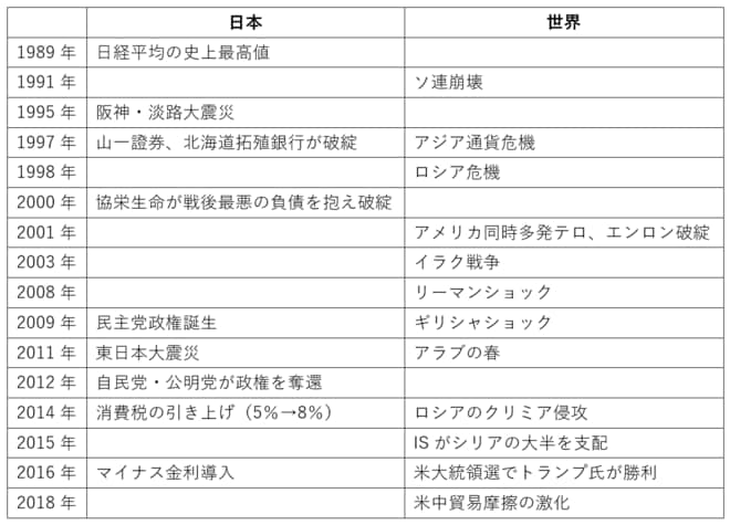 平成に起こった主な出来事を振り返ってみましょう。日本はバブルの絶頂で平成を迎えますが、その後は景気が停滞し、大手の金融機関がいくつも破綻する状況に陥りました。海外を震源地とする経済危機も頻発したこともあり、日本は低成長時代に突入します。
