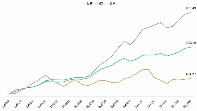 平成から続く経済の停滞を「失われた30年」と呼ぶこともあるようです。1989年から2019年までのGDPを見ると、世界のGDPはおよそ4.3倍に成長しました。しかし日本の成長は約1.6倍にとどまり、G7(同2.9倍)と比べても見劣りします。