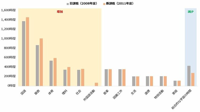 2008年1月17日、学習指導要領が改訂され、いわゆる「脱ゆとり教育」が進められることとなりました。各科目の授業時間は削減や拡充が行われ、全体では小学校の6年間で278時間、中学校の3年間で105時間増えています。