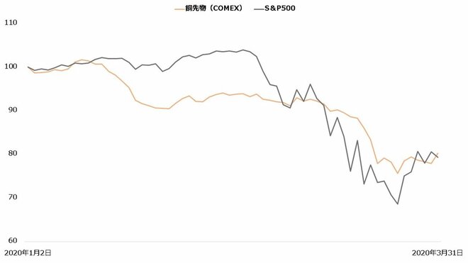コロナショックではどうでしょうか。こちらでも、やはり銅の方が株式より早く反応しました。