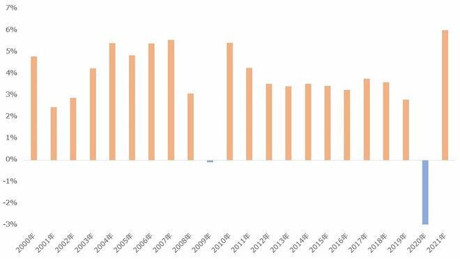 IMFによると、1980年以降、世界がマイナス成長に陥った年は2年しかありません。リーマンショックの翌年にあたる2009年と、新型コロナウイルスが初めて流行した2020年です。
