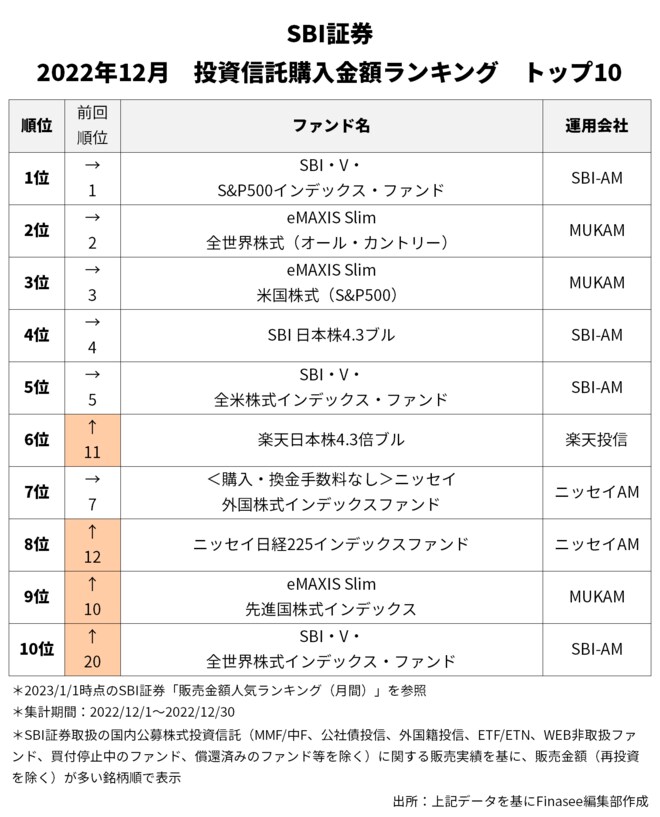 2022年12月、SBI証券で多くの資金を集めたのは以下のファンドだった。