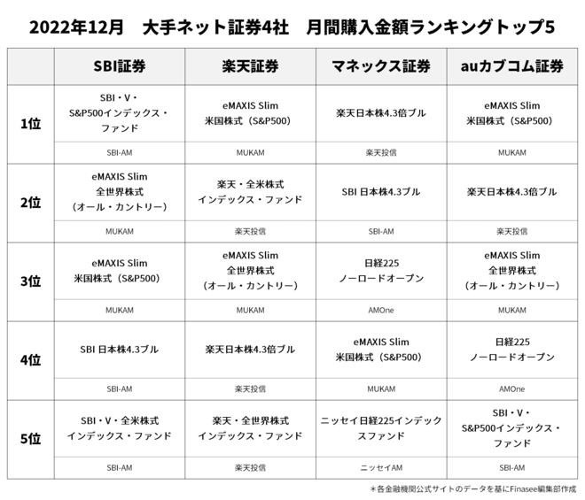 ネット証券4社では、12月もS&P500種指数を対象にしたインデックスファンドが人気だった。三菱UFJ国際投信が運用する「eMAXIS Slim 米国株式(S&P500)」の各ネット証券でのランキングは、以下の通り。