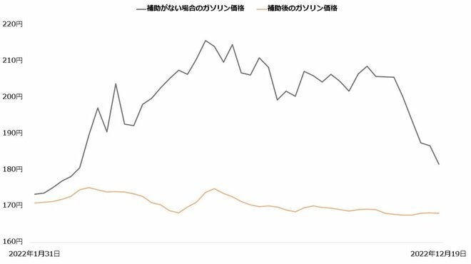 この仕組みにより、2022年のガソリン価格はおおむね170円前後で推移しています。補助がなかった場合のガソリン価格は200円を突破していたとみられることから、価格の抑制効果は十分働いたといえるでしょう。
