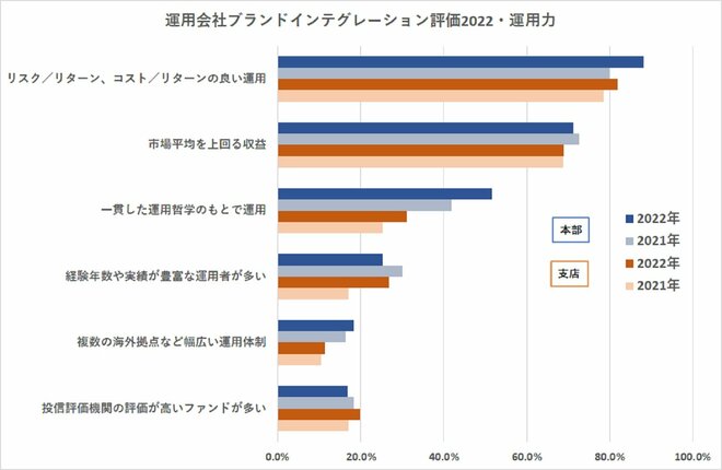 「運用会社ブランドインテグレーション評価」は、投信販売会社が運用会社を評価する調査で、運用会社について「運用力」「商品開発力・企画力」「営業担当者・研修担当者の質」「サポート力」「ブランド力」「ガバナンス」の6つの軸で評価してもらい、得点順にランキングした。2022年調査は9月~10月にWEBで実施し、国内外の運用会社36社を評価の対象とし、310件の回答を得た。