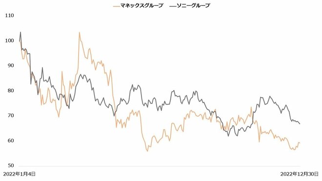 【マネックスグループとソニーグループの株価(2022年1月4日=100)】