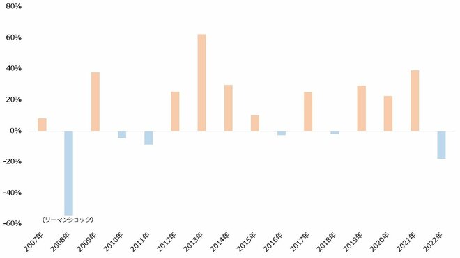 AB・米国株Bコースが人気の理由は、好調な運用成績にあるでしょう。リーマンショックなどで下落した年もありますが、全体では多くの年でプラスを残しました。基準価額も、設定から4倍以上に成長しています(2022年末時点)。