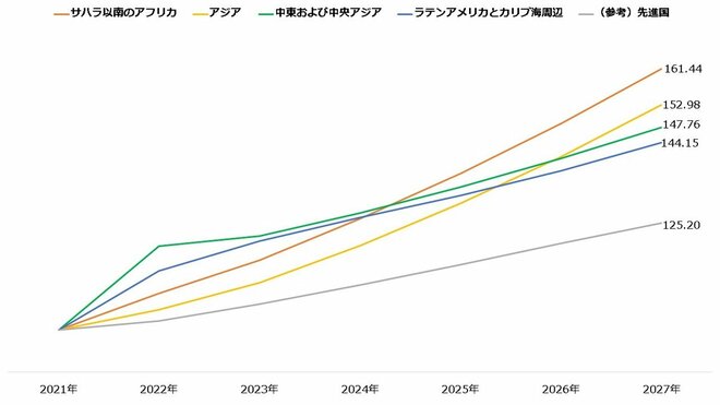 【新興国地域の米ドル建てGDP見通し(2021年=100)】
