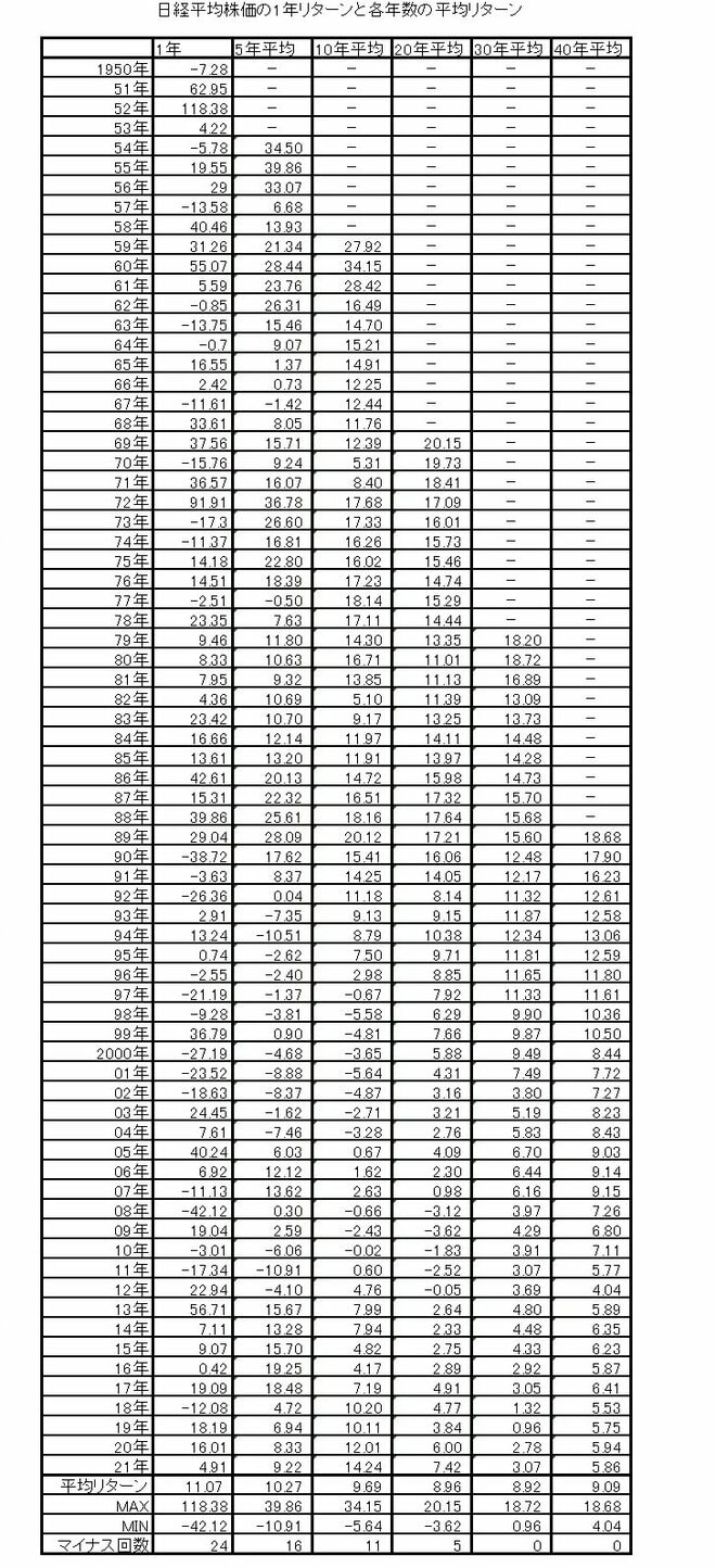 表は1950年から2021年までの日経平均株価の騰落率です。1年は文字通り、1年間の騰落率を1950年から2021年まで見たものです。