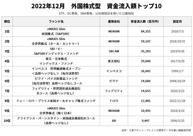 12月の資金流入額1位は「eMAXIS Slim 米国株式(S&P500)」(843.55億円)
