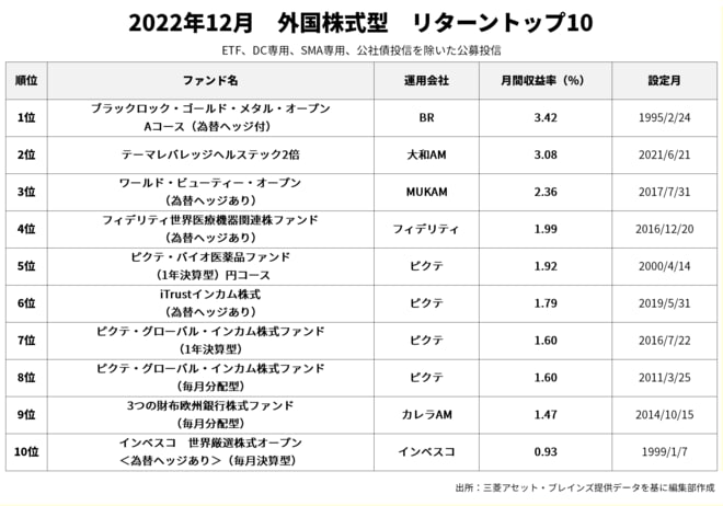 12月のリターン1位は「ブラックロック・ゴールド・メタル・オープン Aコース(為替ヘッジ付)」(3.42%)