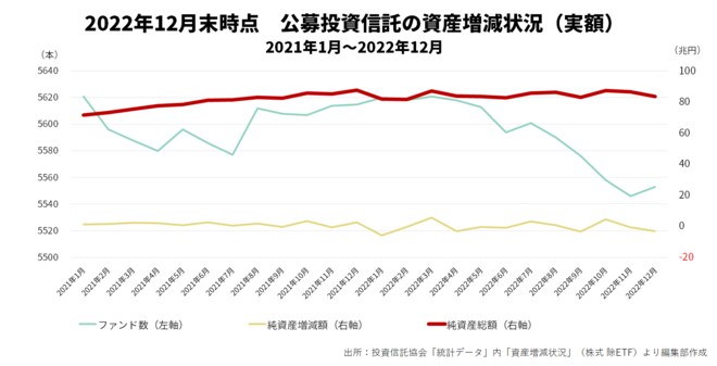 海外株式型、内外資産複合などで資金流入が続いたことから、国内公募株式投資信託には1兆1518億円の資金流入となり、25カ月連続で流入超過となった。ただ、世界的な景気後退懸念が相場の重荷となり、純資産総額は3兆714億円の減少となった。