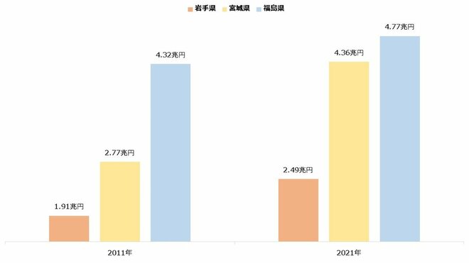 インフラも少しずつ整ってきました。震災で寸断された道路は地元の建設会社29社から52のチームが復興にあたり、2021年12月に全550キロメートルの「復興道路」および「復興支援道路」が全線開通します。経済も再開に向かい、製造業の出荷額も大きく回復しました。