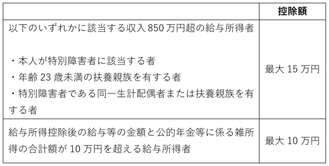 例えば一定の給与所得者は「所得金額調整控除」の適用が可能です。以下2つの種類があり、併用すれば所得から最大25万円分差し引くことができます。