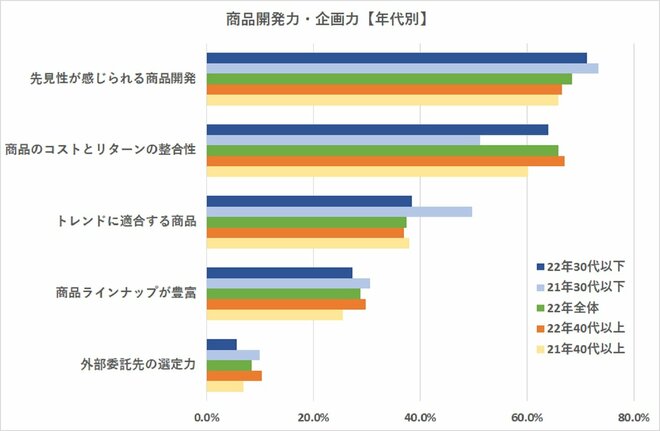 販売会社の若手とベテラン層の間には、運用会社の「商品開発・企画力」に期待するポイントに違いがあるものの、トレンドより「運用コストの低減」を求めるニーズが世代を問わず強くなっていることが分かった。金融リテール専門誌『Ma-Do』が実施した「運用会社ブランドインテグレーション評価2022」で、30代以下の若手と40代以上のベテランが運用会社に期待する「商品開発・企画力」についての回答内容を分析した。「商品開発・企画力」の評価で軸になっている「先見性が感じられる商品開発」については、年代の別なく評価ポイントが高かったが、2021年と2022年を比べると「商品のコストとリターンの整合性」に対する評価ポイントが上がり、反対に、「トレンドに適合する商品」への評価は若手が評価を大幅に下げている。投信の運用成果が出難い2022年の市場を前に、特に、若手の間で「トレンドより、運用コストが低い商品を出してほしい」という思いが強まったのかもしれない。