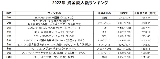 公募投資信託(ETF、DC専用、SMA専用、公社債投信等を除く)の2022年の流出入額は6兆5883億円の流入超過となり、3年連続で流入超となった。そして、分類別のトップ3は、以下の通り。