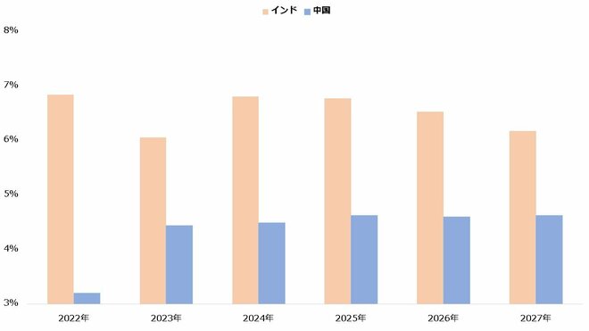 比較的近い将来の経済成長率も、インドは中国を上回ると見られています。IMFの「世界経済見通し(2022年10月)」によれば、名目GDP成長率は2027年までインドの方が中国より大きくなる見通しが示されました。