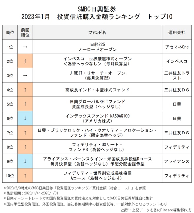 2023年1月、SMBC日興証券で多くの資金を集めたのは以下のファンドだった。