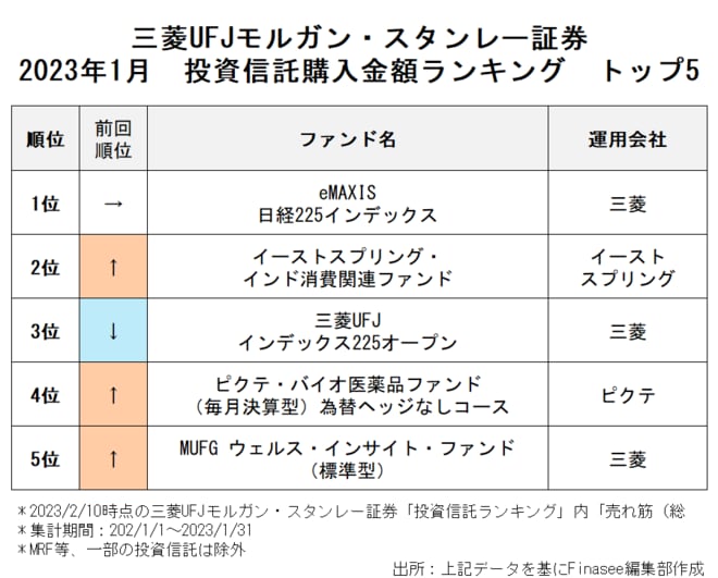 2023年1月、三菱UFJモルガン・スタンレー証券で多くの資金を集めたのは以下のファンドだった。