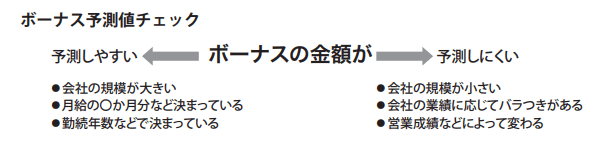 第1・2章で今現在の財産と、この1年のお金の使い方を確認してきました。ここからはいよいよ「いくら貯めていけばいい?」の計算に入っていきます。ボーナスからの預金や、ボーナスの使い道についてまず考えていきましょう。ボーナスは年間に250万円もらう人がいれば、寸志程度という人、さらには年俸制などでボーナスがそもそもない会社も増えています。転職などで会社が変わると、1年目はほとんどもらえないこともあります。会社規模やボーナスの計算の仕方によって、予測のしやすさは変わってきます。まずは自分のボーナスがどの程度当てにできるか、チェックしてみましょう。