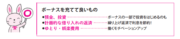 ボーナスを充てて良いものは大きく分けると3つありますが、その1つは「預金」 と「投資」です。年間の預蓄目標などを考えて上手に貯めると良いですし、ボーナスからプールしておいたお金を少しずつ積立投資などに回していくと資産形成の大きな助けになるでしょう。2つ目は繰り上げ返済などの「計画的な借り入れの返済」です。預金の状態や利率 などと相談ではありますが、計画的に繰り上げて利息を節約しましょう。3つ目は「ゆとり・娯楽費用」です。節度を持って旅行やご褒美などに使う計画を立てることで、働くモチベーションをアップさせたいですね。