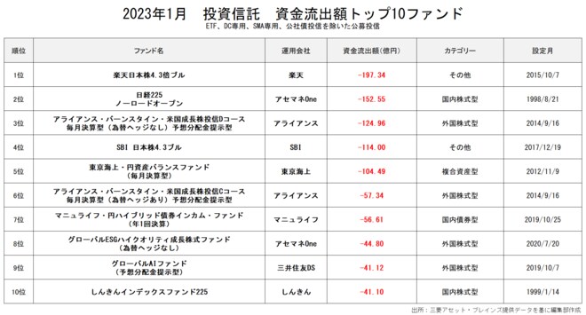 1月の資金流出額1位は「楽天日本株4.3倍ブル」(-197.34億円)