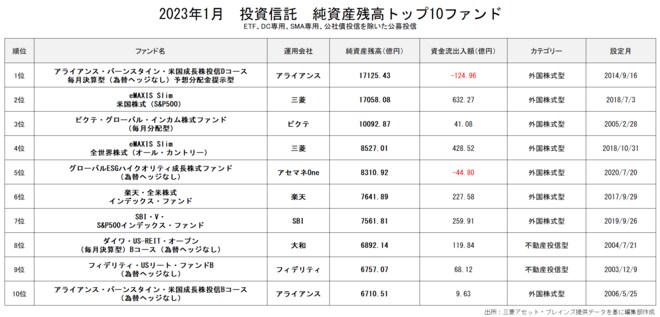 2023年1月の純資産残高1位は、「アライアンス・バーンスタイン・米国成長株投信Dコース毎月決算型(為替ヘッジなし)予想分配金提示型」だった。同ファンドは、マイクロソフトやアマゾン・ドット・コムなど米国の成長株に投資するアクティブファンドである。ただ、基準価額の下落により12月から分配金がでなくなっており、1月は約124億円の資金流出となった。2月になって「eMAXIS Slim 米国株式(S&P500)」に純資産残高が抜かれており、2月末時点でも順位が入れ替わっている可能性は高いだろう。