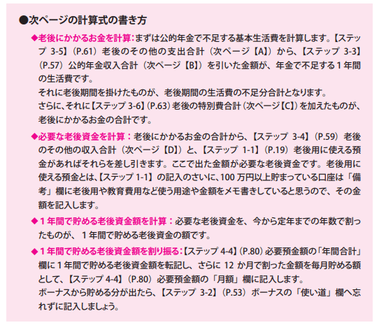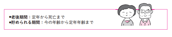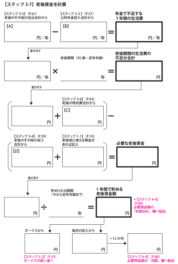 いよいよこの【ステップ 3-7】で老後資金として貯めていく金額を計算していきます。まずは定年年齢を確認しましょう。定年が決まっていないときは65歳や70歳など「ここまでは絶対働く」つもりでいるところで構いません。70歳を過ぎてくると健康状態にばらつきが出てくるため70歳までの年齢にしておくことをお勧めします。夫婦で歳の差があるときは収入の多いほうや、年齢の高いほうを基準に考えましょう。