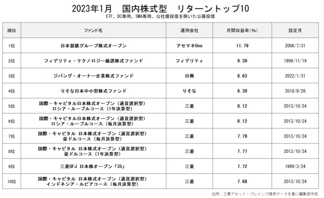 1月のリターン1位は「日本製鉄グループ株式オープン」(11.79%)
