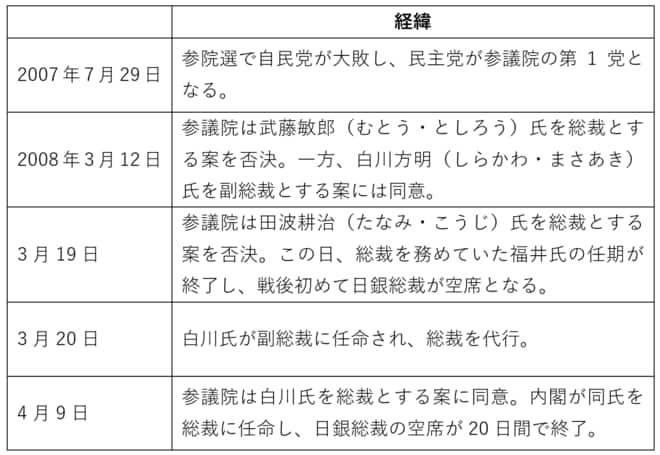 2008年に入ると、当時の日本銀行総裁だった福井俊彦(ふくい・としひこ)氏の任期満了が意識されるようになります。日本銀行の総裁は、衆議院と参議院の両方で過半数の承認を得なければ任命できないためです。この懸念は当たり、民主党らは自民党が提示する人事案に相次いで反対しました。そして、後任が決まる前に福井氏の任期が終わってしまいます。日本銀行の総裁が空席となるのは戦後初めてのことでした。