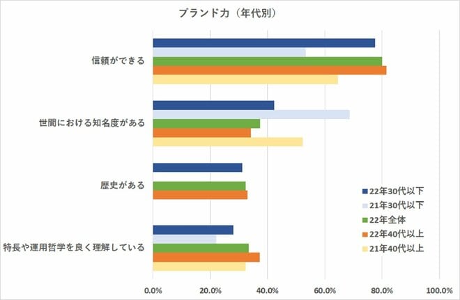 2022年の市場の変化は、販売会社が運用会社を評価する際に、「世間的な知名度の高さ」よりも「信頼ができる」ことを重視する姿勢に変えた。金融リテール専門誌『Ma-Do』が実施した「運用会社ブランドインテグレーション評価2022」で明らかになった運用会社の「ブランド力(識別力)」に関する評価の差は、20代、30代の若手販売員と40代以上のベテランの差なく、「信頼ができる」という一点に高い評価が集中した。