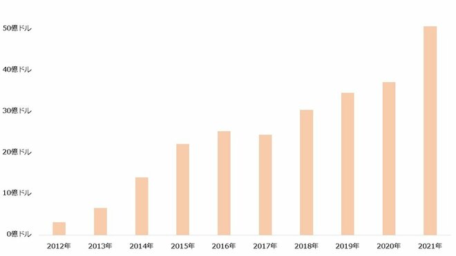 ツイッターは2013年11月、ニューヨーク証券取引所に上場します。これも手伝って知名度がさらに向上し、ツイッターの利用者は全世界に広がりました。2022年4~6月期における1日あたりアクティブ・ユーザー数は2億3780万人にも上っています。利用者が増えるにつれ広告収入などが増加し、2021年の売上高は50億ドルに到達しました。
