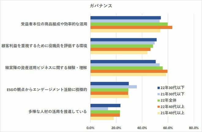 運用会社の「ガバナンス」に関して販売会社が評価するポイントは、若手とベテランの別なくトップは「受益者本位の商品組成や効率的な運用」(若手は22年の回答率が54.4%、ベテランは63.2%)だったが、2位以下の評価ポイントで若手とベテランの考え方が分かれている。ベテランは、2番目に高い評価を「経営陣の資産運用ビジネスに関する経験・理解」に置いている。この項目についてベテランは、21年は58.4%でトップの評価項目にしていたが、22年も59.5%と依然として高い評価を与えている。