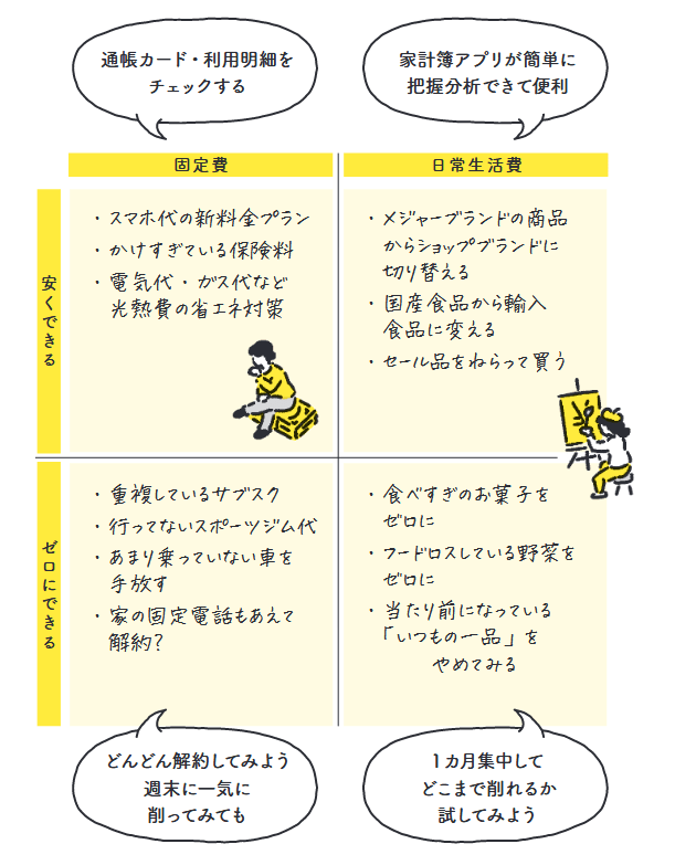今回の軸は「固定費か日常生活費か」と「ゼロにできるか、安くできるか」です。この4マスをイメージできると節約をより具体化しやすくなります。