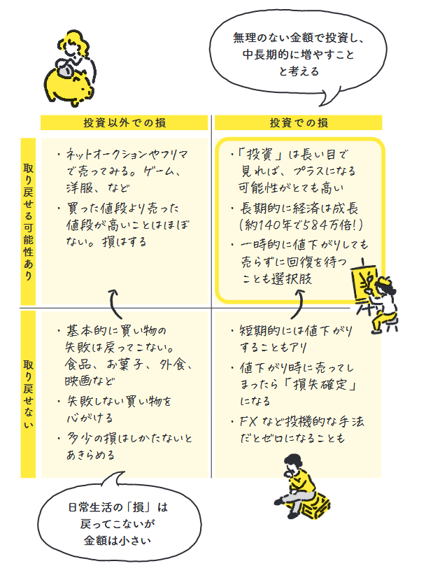 最近ではメルカリなどのフリマアプリがあるので、服などは、買って失敗しても売りに出すことで、何割かの損を取り戻せることもあります。しかし全額が戻ってくることはまずありません。こちらは「投資以外で損をする&取り戻せる可能性あり」のパターンということになります。