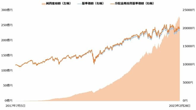 「農林中金<パートナーズ>長期厳選投資おおぶね」(以下:長期厳選投資おおぶね)は、実質的な運用者である「農林中金バリューインベストメンツ(NVIC)」が機関投資家向けに提供してきた商品と同様の戦略で運用される投資信託です。純資産総額はほぼ右肩上がり増加しており、2023年2月には280億円に到達しました。