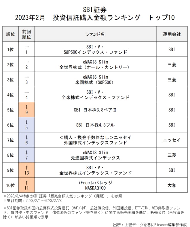 2023年2月、SBI証券で多くの資金を集めたのは以下のファンドだった。