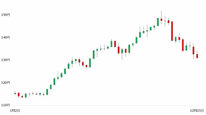 その点で、2022年はFX投資家にとって多くのチャンスに恵まれた年でした。ドル円のレートは、日米の金利差拡大などが意識され115円台から150円台にまで大きく上昇したほか、日本の為替介入や金融緩和の修正などで大きな値動きがたびたび生じました。値幅はFXにおいて利益の源泉ですから、多くの取引を誘引したと考えられます。