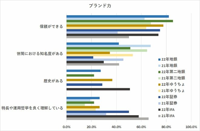 反対に「世間における知名度がある」という項目は全業態で評価ポイントを下げた(地銀が67.5%から41.9%、第二地銀が64.7%から51.2%、ゆうちょ銀・郵便局は53.2%が34.7%、証券会社は45.5%が21.4%、IFAは42.1%が29.8%)。21年と22年で「ブランド力」に関する価値感が大転換していることがわかる。
